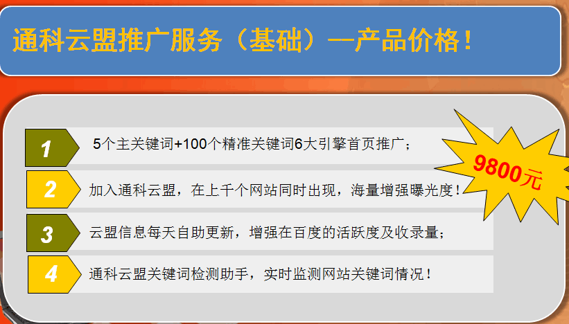備注: 1、以上價格不包含網站制作及上傳產品資料,如需上傳產品資料及制作圖片,公司將收1000元制作成本(包含50個產品資料),如要上傳更多,按一個產品20元算;如果企業(yè)要個性化制作網站,價格另談. 2、5+100關鍵詞推廣為全包服務,客戶無需再做其它操作,無需培訓,效果即查即看。 3、通科云盟系統(tǒng)需要客戶提供FTP密碼、網站后臺密碼,這是前提! (通科云盟推廣價格--首創(chuàng)5+100關鍵詞百度等搜索引擎首頁排名推廣;主關鍵詞+精準關鍵詞雙線出擊;100精準關鍵詞推廣、多關鍵詞推廣方法、百度關鍵詞推廣、SEO優(yōu)化推廣方法、全網營銷推廣) |