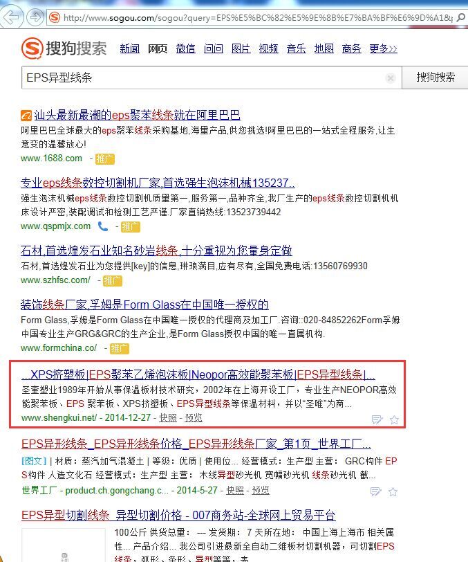 關(guān)鍵詞“EPS異形線條”在搜狗排名:首頁第一條;排在 4個付費推廣之后,好熱門的詞,我們點擊不用錢,人家要花費多多,呵呵。。。