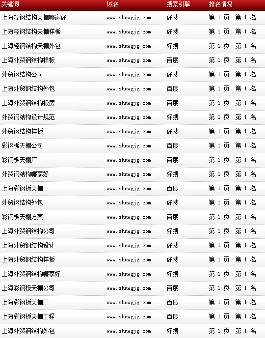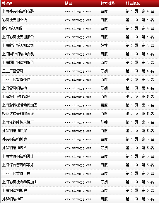 各關(guān)鍵詞在各大搜索引擎排名情況: