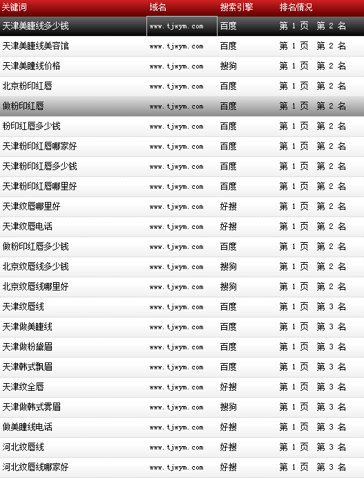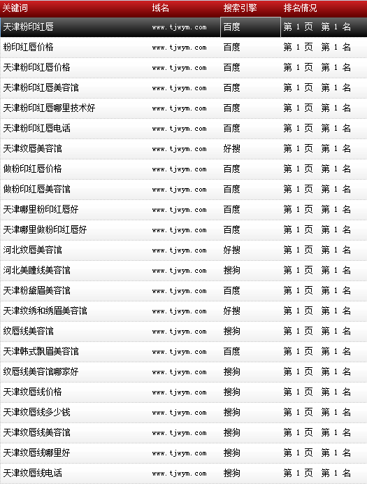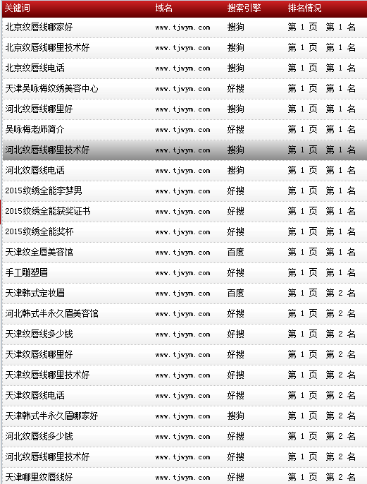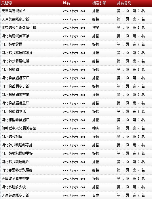 各關(guān)鍵詞在各大搜索引擎排名情況: